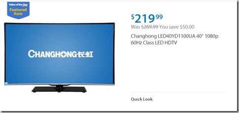 Here is today’s Walmart Value of the Day! You can get a Changhong LED40YD1100UA 40" 1080p 60Hz Class LED HDTV for $219.99. Here are the details: The Changhong LED40YD1100UA 40" 1080p 60Hz Class LED HDTV features a brilliant 1080p HD picture for your viewing pleasure. Connect up to three HD devices via the provided HDMI ports. Note: You must have… Continue Reading