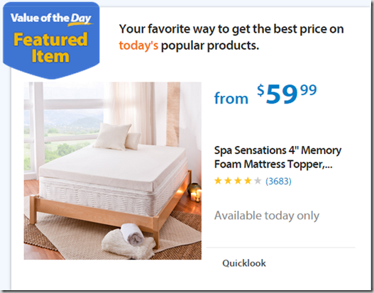 Here is today’s Walmart Value of the Day! You can get a Spa Sensations 4” Memory Foam Mattress Topper, Multiple Sizes for $59.99! Here are the details: Spa Sensations is a collection designed by Sleep Revolution to help you discover a better, more comfortable sleep with style and convenience. The Spa Sensations memory foam mattress topper cradles you in comfort,… Continue Reading