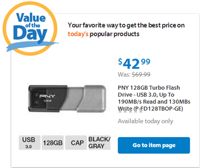 Here is today’s Walmart Value of the Day! You can get a PNY 128GB Turbo Flash Drive – USB 3.0, Up To 190MB/s Read and 130MBs Write (P-FD128TBOP-GE) for just $42.99!